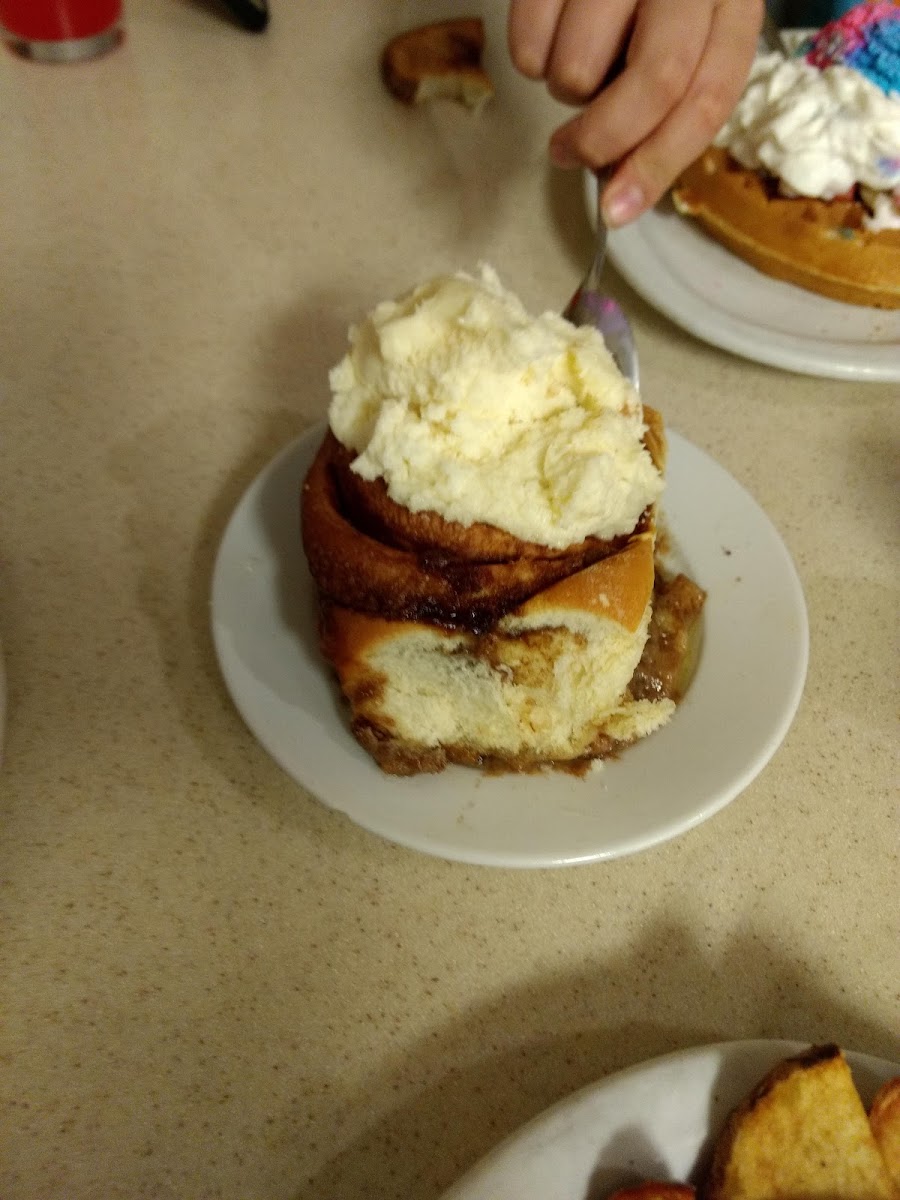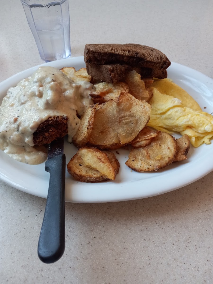 4.3 - We ate outside, it was a beautiful Sunday. The service was great, a little slow but worth the wait. The food came out hot. They were kind enough to split the our veggie scrambler, which was a little underwhelming but the rest of the food was fantastic. Waffle, cinnamon roll, and chicken fried steak. The homemade jams really make everything better. I had the red, white and blue (raspberry, blueberry and cream cheese frosting) cinnamon roll. We’d definitely come back.